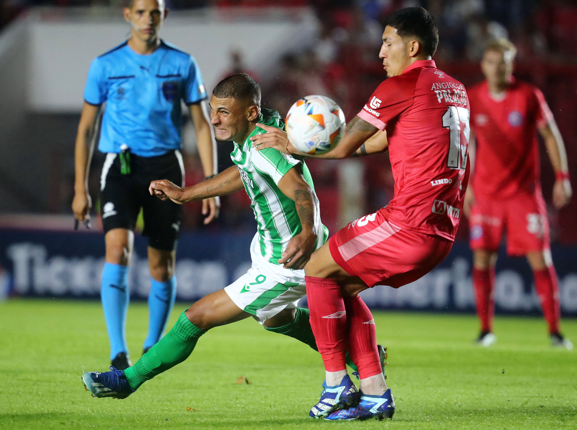 Dylan Nandin, de Racing, y Tobías Palacio, de Argentinos Juniors, el 9 de abril, en el estadio Diego Armando Maradona de Buenos Aires.