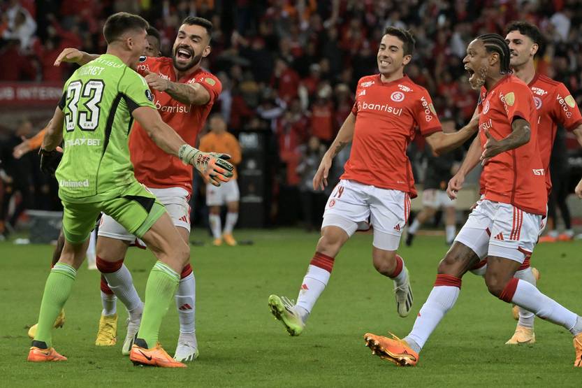 El arquero de Internacional, Sergio Rochet, y sus compañeros después de derrotar a River Plate, en el estadio Beira-Rio de Porto Alegre, Brasil (08.08.2023).