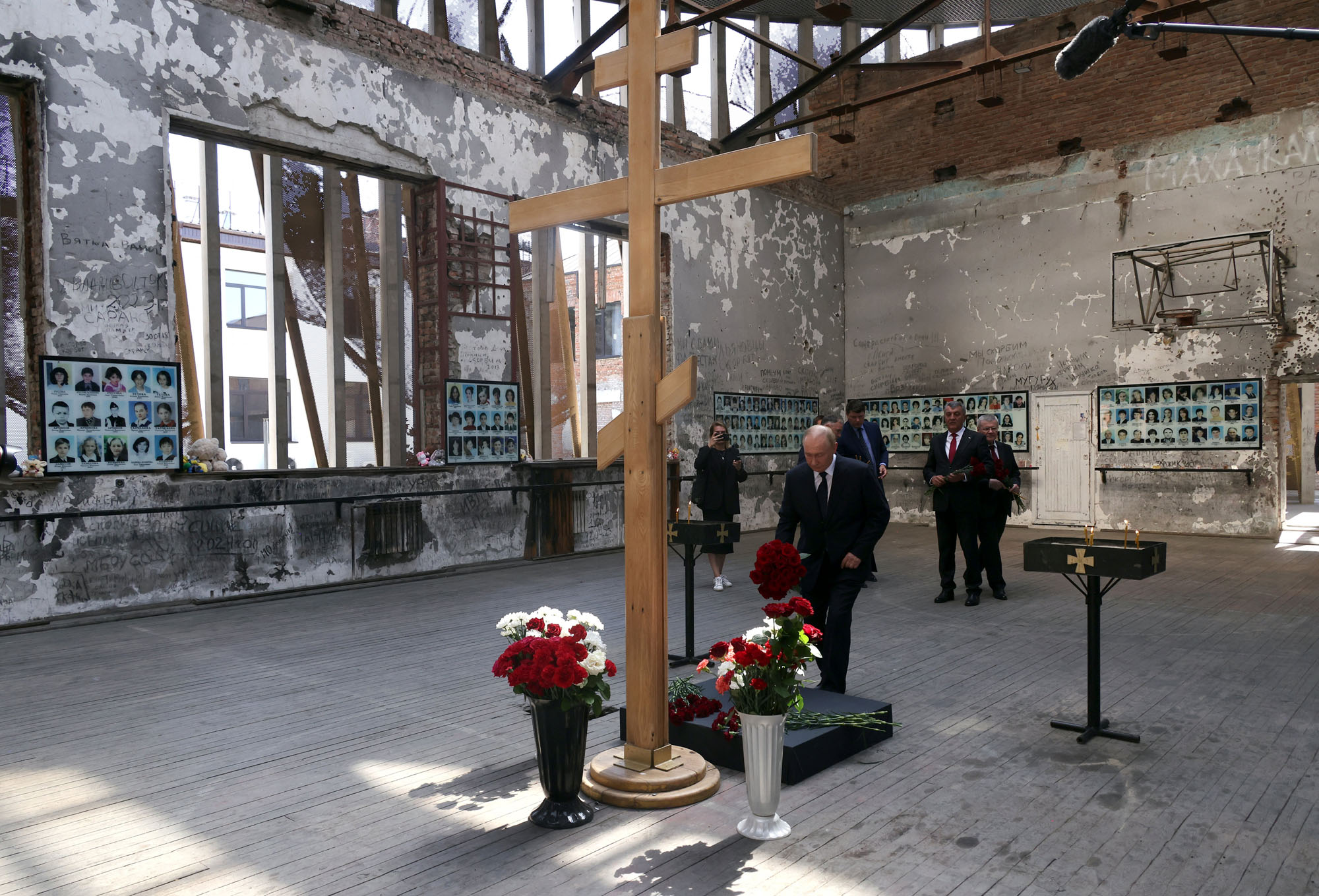 Vladimir Putin visita el lugar de la escuela destruida, donde en 2004 militantes chechenos tomaron como rehenes a más de mil personas, el 20 de agosto, en Beslán.