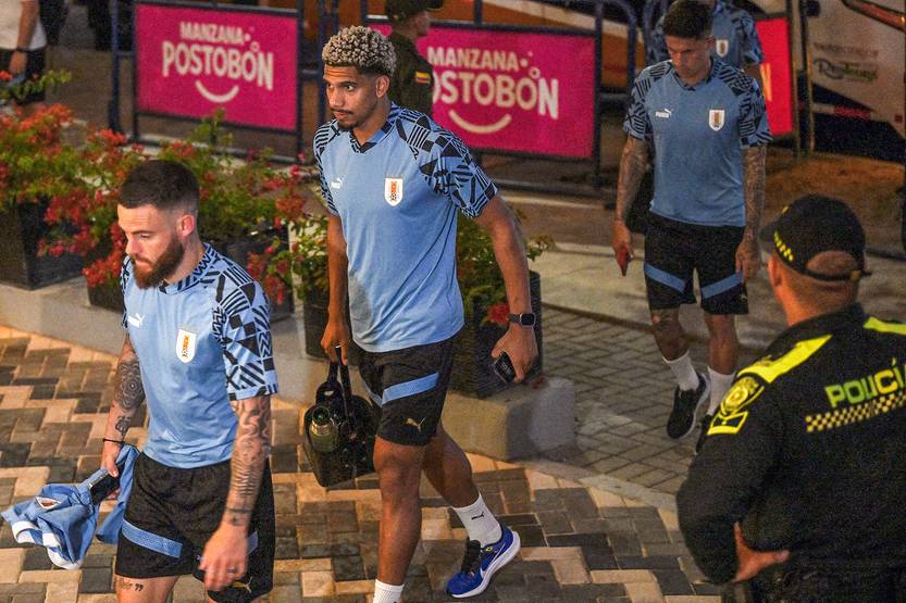Nahitan Nandez y Ronald Araujo llegan al hotel en Barranquilla, Colombia, el 11 de octubre.