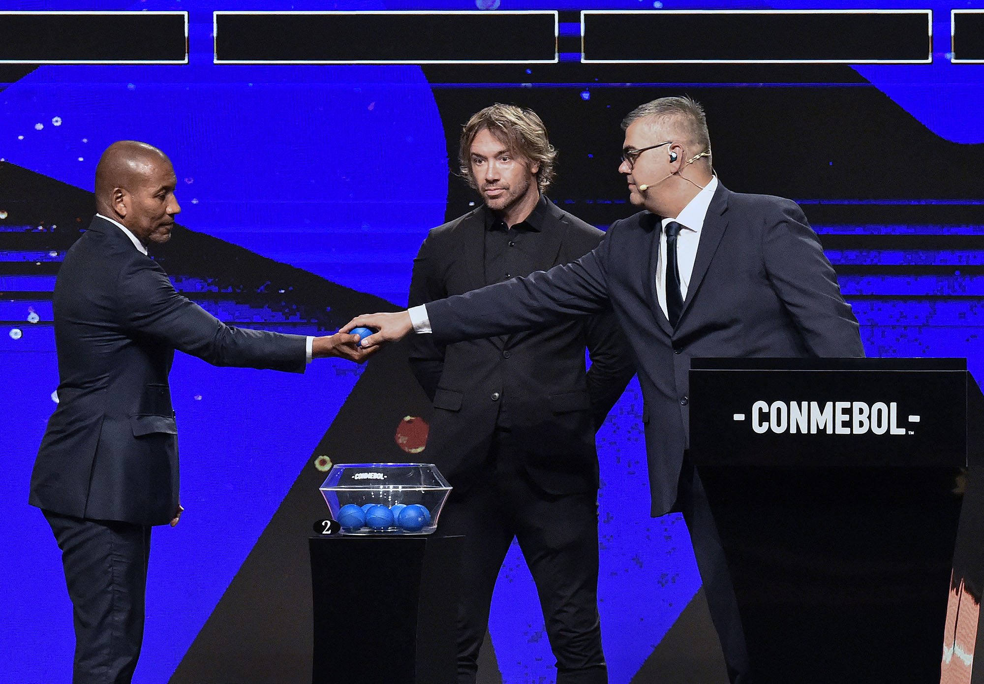Frederico Nantes (d), Mauro Silva (i) y Diego Lugano, durante el sorteo de la Copa Sudamericana, en Luque, Paraguay (27.03.2023).