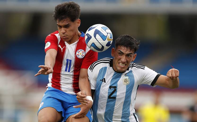 Leonardo Rolón, de Paraguay, y Lautaro Di Lollov, de Argentina el sábado, en el estadio Pascual Guerrero, Cali, Colombia.