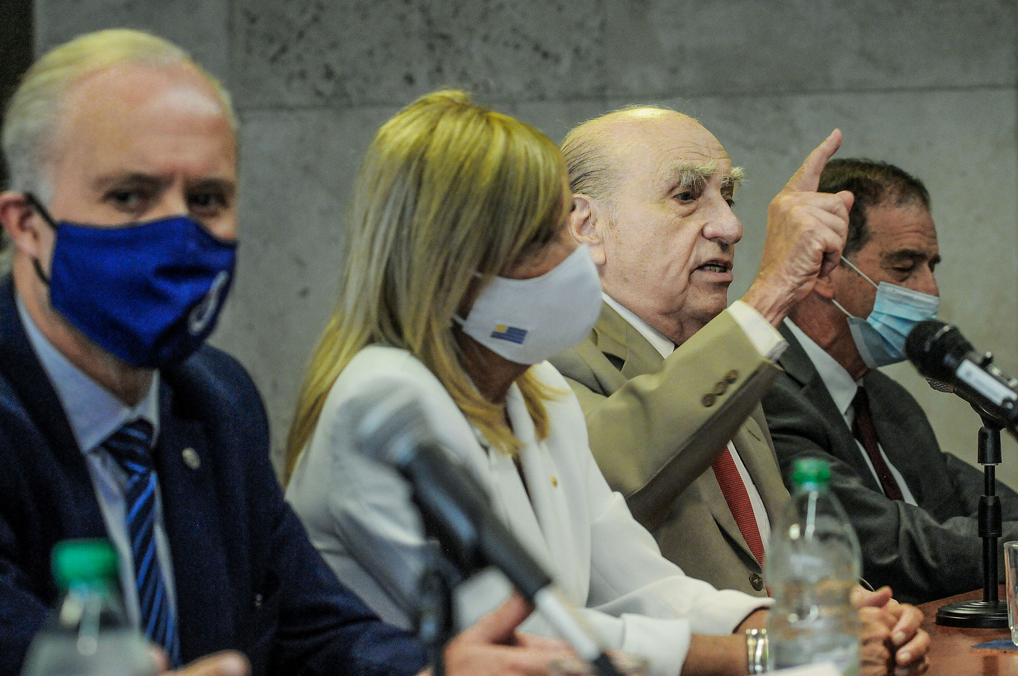 Pablo Iturralde, Beatriz Argimón, Julio María Sanguinetti y Guido Manini Ríos, en el lanzamiento de la campaña en defensa de la LUC, este lunes, en el anexo del Palacio Legislativo.