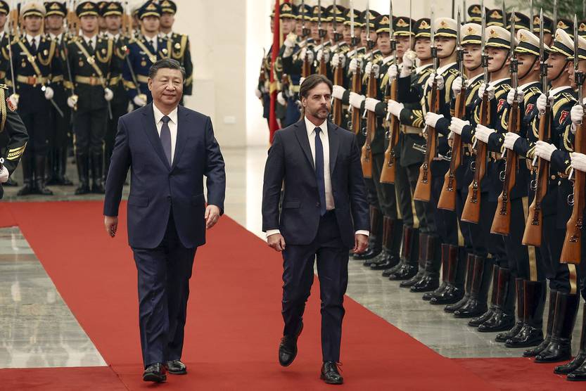 Xi Jinping, presidente chino, y Luis Lacalle Pou, presidente uruguayo, pasan revista a una guardia de honor, en el Gran Palacio del Pueblo en Beijing (22.11.2023).