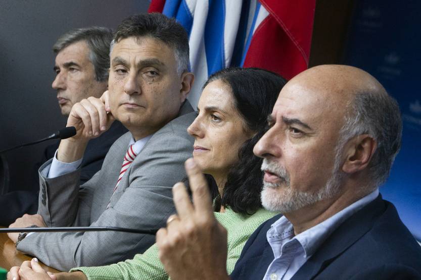 Mario Aristi, Isaac Alfie, Azucena Arbeleche y Pablo Mieres, en conferencia de prensa, en el Parlamento (22.03.2023).