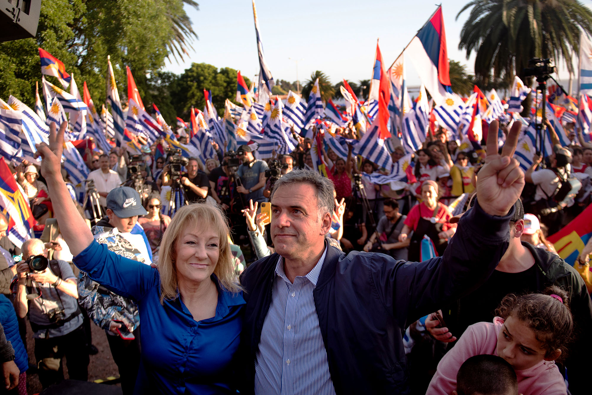 Carolina Cosse y Yamandú Orsi durante el Banderazo por Uruguay, el 3 de noviembre, en la Rambla Sur de Montevideo.