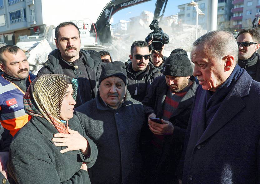 Recep Tayyip Erdogan, presidente turco, visita un edificio derrumbado en Hatay, Turquía (08.02.2023).