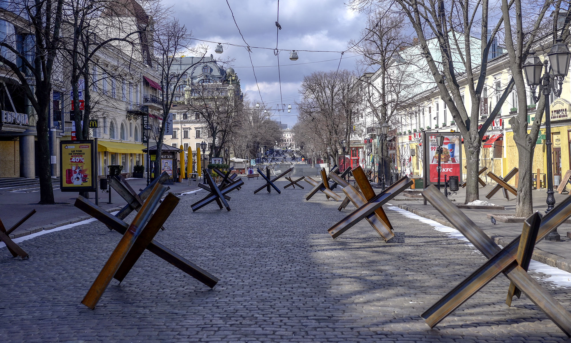 Defensas antitanque, este domingo, en una calle de Odessa, Ucrania.