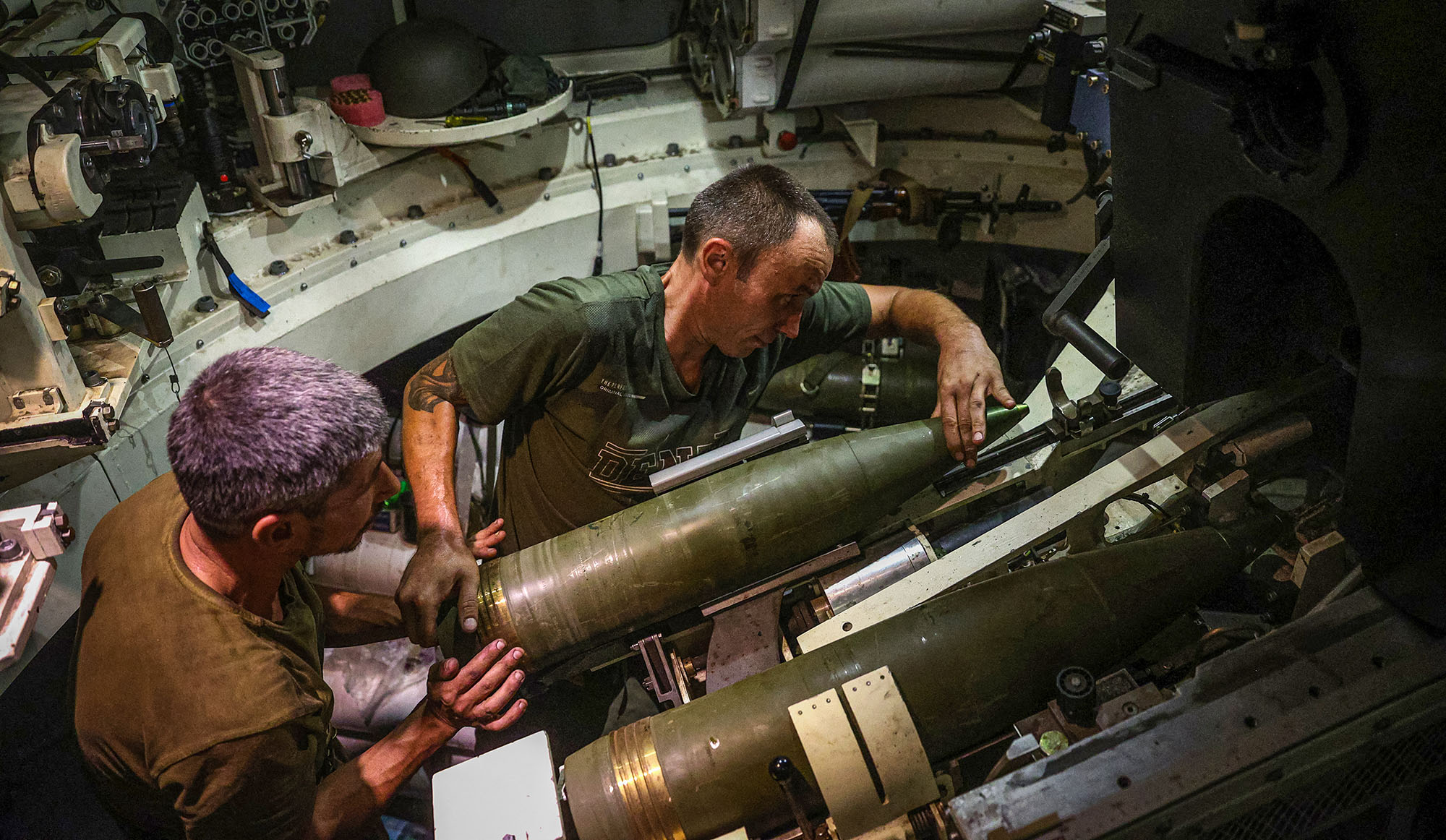 Militares ucranianos trabajan dentro de un cañón autopropulsado con orugas Krab polaco de 155 mm, en el frente en la región de Donetsk (29.08.2022).