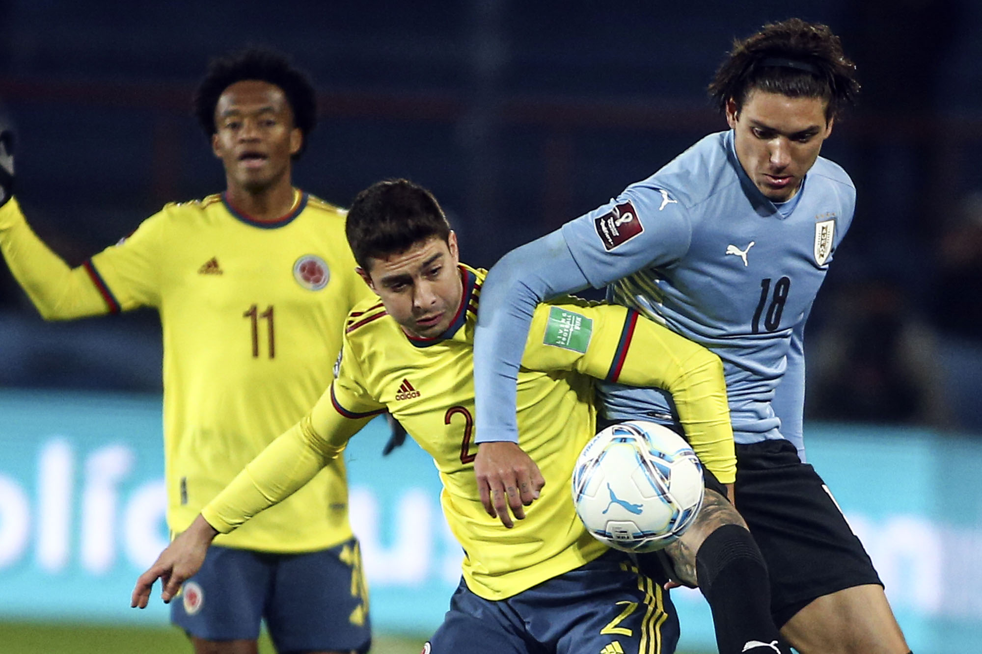 Darwin Núñez, de Uruguay, y Stefan Medina, de Colombia, el 7 de octubre de 2021.