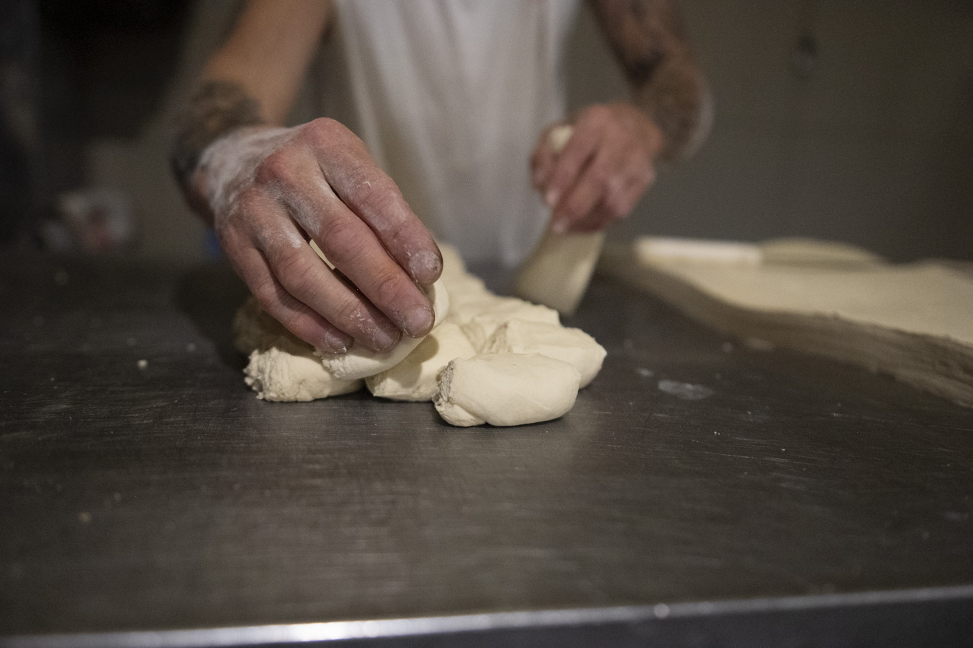 Antes, una masa de tres o cuatro metros de largo y uno de ancho que ponen sobre la mesada de madera para untarla con grasa y espolvorearle harina por encima antes de enrollarla; antes, una manta de masa de más de diez kilos que Eduardo agarra, pasa por la sobadora —una máquina que la afina y la deja de espesor uniforme—, dobla al medio y vuelve a pasar, así casi 20 veces; antes, cinco litros de agua, 250 gramos de sal, 500 gramos de azúcar, 70 gramos de levadura y 10 kilos de harina que pasa primero por la balanza y luego mete en una batidora industrial por varios minutos.